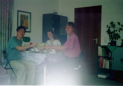 7時少し前にフランクが会社から戻って来て、彼とも久しぶりの再会を果たす。すぐに3人でシュトゥットガルトの街に出て、2人がいろいろな建物やその他について説明をしてくれたのである。さらに今日はワインフェスティバルをやっているというのでそこにも行くことにする。ドイツというと「ビール」というイメージであるが、2人に聞いたところそれはバイエルン州(ミュンヘンなど)の話で、ここシュトゥットガルトのあるヴェルテンブルク州(?)ではワインを飲む人の方が多いと説明してくれた。あと、ソーセージもドイツというイメージがあるが、確かにベルリンなどではたくさんのお店を見かけたが、ここシュトゥットガルトではあまり見かけないのである。つまりここシュトゥットガルトは想像していたドイツとはかなり違ったのである。お祭りの行われている通りで、ドイツ(シュトゥットガルト)の主な料理の盛り合わせみたいなものをおごってもらった。7種類ぐらいの料理が少しずつ盛ってあるのだが、1種類だけあまりおいしくなく残してしまった。その後、ワインを飲もうとしたのだが、あまりの人出でどこのお店も席が空いて無く、お祭りの通りとは少し離れたお店に行き、ワインとビールをまたごちそうになる。日本ではお酒(アルコール)を飲みながら何かを食べ、また何かを飲むというように飲んだり食べたりするというと、こちらでは何かを食べた後(たまに食べないときもある)にワインやビールだけを飲む(何もつままない)と言っていた。今日は週末で2人とも疲れていたし、自分疲れていたので2杯ほどでやめ(それでも11時を過ぎていた)家に帰ることにした。2人の家は車で10分ぐらいの所だったが、高台にあり市内の夜景がきれいに見えるところでなかなかよかった。さっとシャワーを浴びさせてもらい、ソファーに寝かしてもらった。