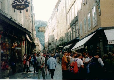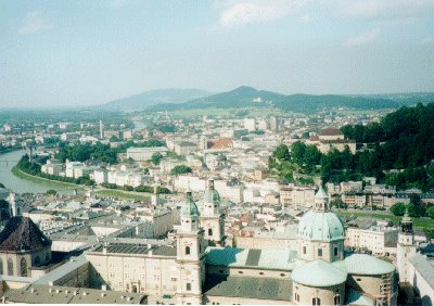 いきなり曲がる角を間違えてしまいちょっと遠回りをしてしまったが、三位一体教会などをみて旧市街の方へ行く。モーツアルトの生家があるという一番にぎやかな通りを歩くが、なぜか見逃してしまう。もう一度戻って来つつ見つけるが、やはりあまり興味がないので結局入らなかった。興味がないところに「せっかくだから」といって入っても、結局退屈してしまうことが多く、見境無く入ることを控えようと思ったのである。その後大聖堂の方に歩いていき城に登ることにする。ここでも地球の歩き方にはケーブルカーが39ATSと書いてあったが、行ってみると往復69ATS、片道59ATSもするのであるって登ることにする。坂は急だが15分も市内でチケット売場まで着いてしまう。