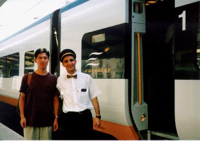 11:43分ちょうどに出発し、すぐにジュースかシャンパンを配りに来てくれた。今回は奮発して1等車なので朝食サービスがつくのである。もちろん母親のお金ですけど...(^^;) でも、ユーレイルとフランスレイルパスを持っているので、2人ともパスホルダー料金でOKである。昼食だがこれもまた飛行機の機内食みたいな感じであった。ユーロスターは飛行機を意識しているといわれているが、本当にいろいろな面でそれが感じ取れる。ここでちょっとした失敗をしてしまう。食事にでてきたプレートにはパン、テリーヌ、ケーキ、飲み物といったものがのっていた。「なんか少ないなぁ」とは思いつつもこれらをすべて食べてしまったのである。そうしたらやはり後から、メインディシュであるサーモンかビーフを配りにまわってきたのである。つまり、メインを食べる前にデザートのケーキを食べてしまったのである。ということなのでこれからユーロスターの1等車に乗る人は気をつけましょう! (^^;)