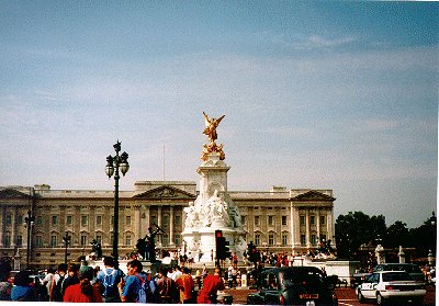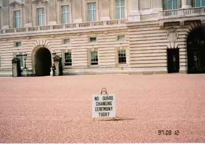 次にこれまたツアーのルートには絶対組み込まれているであろうビッグベンに向かう。といってもウエストミンスター寺院のすぐ近くで歩いて2~3分のところである。ここは外から眺めるだけで、特に中に入って見学みたいなものはできないようなのでさっさと次のバッキンガム宮殿に向かう。ここへもビッグベンから歩いて15分ぐらいで着いたが、一見した感じでは思っていたほどではなかった。地球の歩き方には「夏期は毎日11:30分から衛兵交代式が行われる」と書いてあったので、11時ごろ着くようにとわざわざ計画を立ててきたのである。しかし、なんと今日は行われないとのこと。しかも看板がぽつんと出ているだけで特に理由などはないらしい。もちろん他にも見に来た人はいっぱいいるのだが、みなさんしょうがないなぁといった感じでただあきらめるしかない模様。もちろん私たちもただあきらめるしかない。宮殿内部を一部だけ公開しているそうなので見に行こうとするが、チケット売場が変なとこにあるのとすでに行列ができていてあっさりあきらめる。