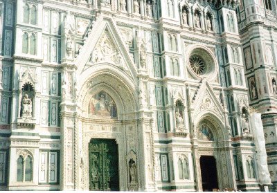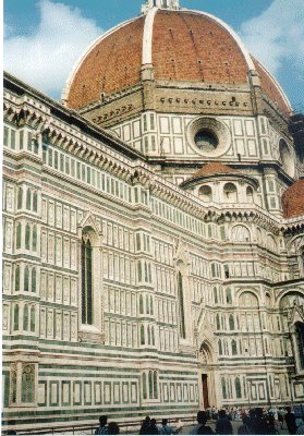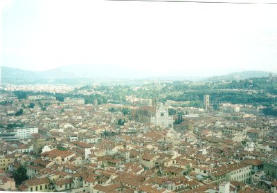 14:30分フィレンツェ(フローレンス)に到着する。荷物を例のごとく預かり所に預けて早速ドゥオモに行く。ここFirenzeのドゥオモもすごかった。ミラノとは全く違う外壁や形なのである。サンジョバンニ洗礼堂は無料と書いてあったのに3,000リラになっていた。もちろんクーポラに登ったのだが(8,000リラ)はっきり言ってこのクーポラからの眺めは最高である。ミラノのドゥオモは建物自体はすごいのだが、屋根に登っても眺めはいまいちであった。それに比べ、Firenzeのドゥオモのクーポラからの眺めはまさに絶景である。フィレンツェは、れんが色の屋根が小高い山々に囲まれてとてもよいコントラストなのである。