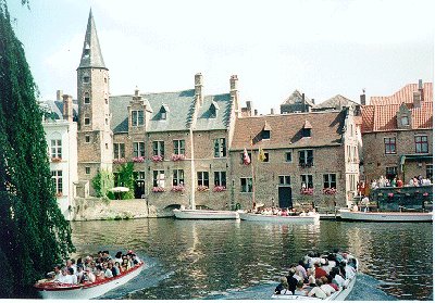 次に市庁舎と聖血礼拝堂を見た後、ボートに乗ってブルージュの運河を見て回る観光船に乗ることにした。このボートは4,5カ所乗り場があり、客引きで競争しているようで あったが、どこも同じルートを通るのでどこのに乗っても同じだと思う。もちろん、ガイドをしてくれる人(兼運転手)の当たり外れなどはあるかもしれないが。しかし、4カ国語ぐらいを混ぜてしゃべっているので日本人にはあまり関係ないかも? 少なくとも私には理解できなかった。ずっと英語で話してくれればもう少しわかったかもしれないが、ベルギー、フランス、ドイツ、英語を混ぜているのでそこから英語だけど聞き取ろうとしても神経疲れちゃう。しかし、この観光ボートたったの170BFrで40分近くまわってくれるので絶対おすすめだと思う。