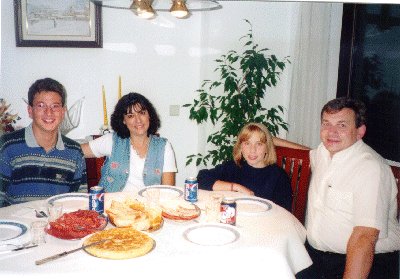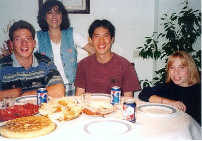 21時頃にやっと夕飯となる。スペインでは14時頃に昼食を食べ、21時頃に夕飯を食べるのが一般的であるらしい。確かに地球の歩き方にはスペインタイムは徐々に緩和されていると書いてあったが、そうでもないらしい。今日のメニューはジャガイモと小麦粉を混ぜたものを焼いた(ふかした?)スペインオムレツと、パンにバターとトマトの種の部分を塗ったものがメインである。これらは両方ともカタルーニャ地方の名物料理だそうである。それとチーズとハム、サラミが数種類といった感じである。例のごとく、食事時の話題としてはやっぱり"すし、刺身"と"ライス"である。:)